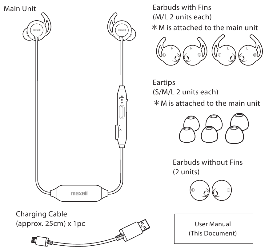 At the time of purchase, M size earbuds with fins are attached to the main unit. If size M does not fit your ears, please replace with the size L. If you do not use the earbuds with fins, please replace with the one without fins.