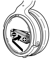 - Insert the supplied rechargeable battery into the left housing of the headphones. Observe the correct polarity when installing battery.