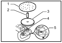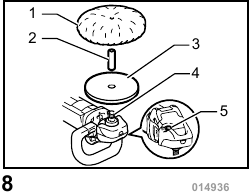 To install the wool pad, first remove all dirt or foreign matter from the backing pad. Press the shaft lock and screw the backing pad onto the spindle. Insert the sleeve 18 into the center hole of the backing pad. Using the sleeve 18 as a positioning guide, install the wool pad on the backing pad with the sleeve 18 inserted through the center hole of the wool pad. Then remove the sleeve 18 from the backing pad.