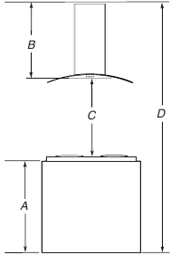 - Hood height from ceiling to bottom of the range hood filter surface: D-A-C=B