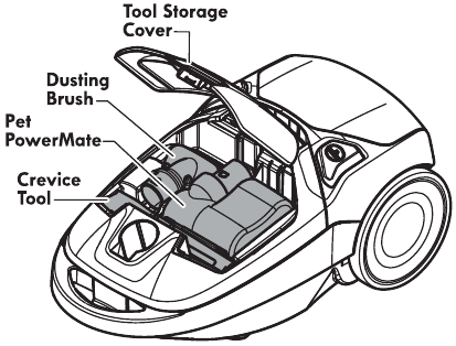 NOTE: To remove Pet PowerMateTM, dusting brush, and/or floor brush, press the tool release button and slide out.