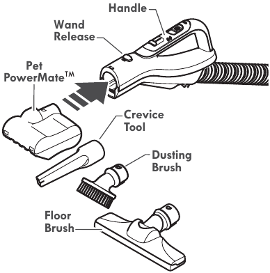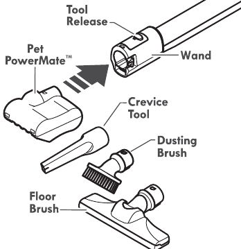 NOTE: To remove Pet PowerMateTM , dusting brush, and/or floor brush, press the Wand Release button and slide out.