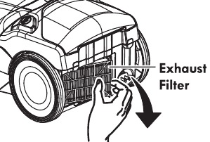 The exhaust filter cartridge must be replaced when dirty. Replace the filter when the entire surface area is covered evenly. The filter CANNOT be washed as it will lose its dust trapping ability.