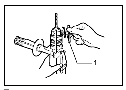 The depth gauge is convenient for drilling holes of uniform depth. Loosen the side grip and insert the depth gauge into the hole in the side grip. Adjust the depth gauge to the desired depth and tighten the side grip.