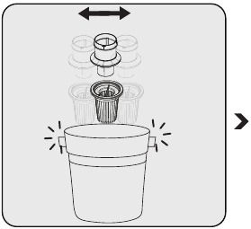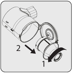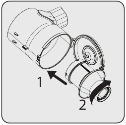 - To insert the plastic filter, firstly place the plastic filter (1), then rotate it clockwise to lock it (2).