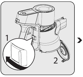- For a detailed cleaning of filters, remove the dust container by pushing the button to the left side.