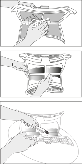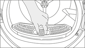 Ensure that hair, fibre and cotton balls do not fall into the slot where the filters are installed. - Open both of the lint filters (outer and inner) and remove the fibres with your hands or with the brush on the air deflector. You can clean the hair in the filters with a vacuum cleaner.