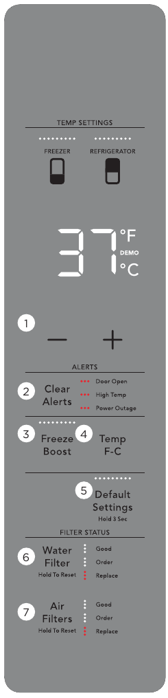If the freezer or refrigerator doors are left open for five minutes or more, an alarm sounds and the door open indicator illuminates on the display. Close the door or press any key on the display to silence the alarm. The control panel will return to normal operations after the door is closed.