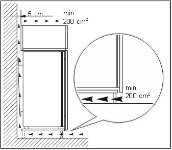 ² the height, width and depth of the appliance including the handle, plus the space necessary for free circulation of the cooling air * including the width of the bottom hinges (8 mm)