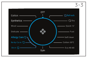 The function buttons (Fig. 3-6) enables additional options in the selected programme before programme starts. The related indicators are displayed. By switching off the appliance or setting up a new programme, all options are disabled. If a button has multiple options, the desired option can be selected by pressing the button sequentially. By pressing the buttons, the function is selected.