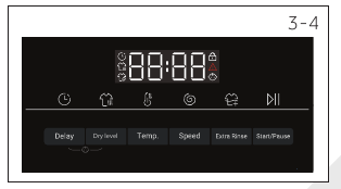Press Dry level button, the display dL-3, it means that clothes can be stored directly after drying. By press the button sequentially, drying time can be set 30, 60, 90,120, 150 minutes, the drying icon lights up. If the display show or no value the display "0", the drying function is deactivated, the drying icon is not lit.