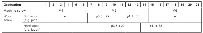 Before actual operation, drive a trial screw into your material or a piece of duplicate material to determine which torque level is required for a particular application. The following shows the rough guide of the relationship between the screw size and graduation.