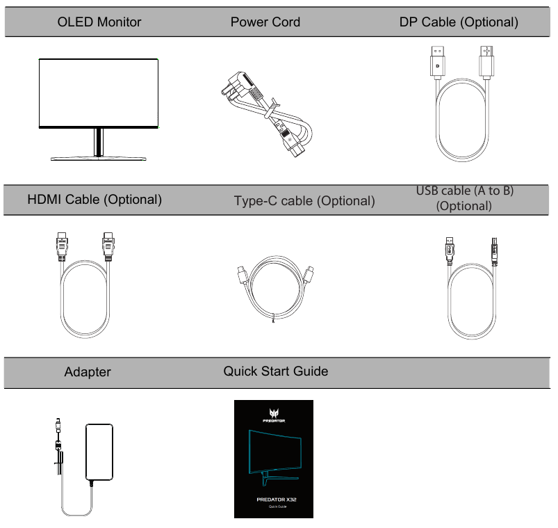 Please check the following items are present when you unpack the box, and save the packing materials in case you will need to ship or transport the monitor in future.