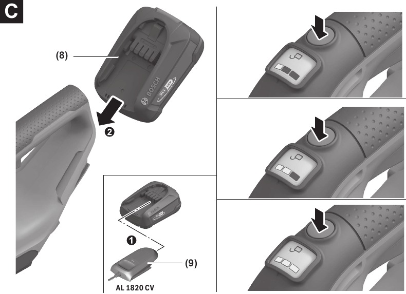 The battery charge-control indicator indicates the remaining battery capacity or an overload when the power tool is switched on.