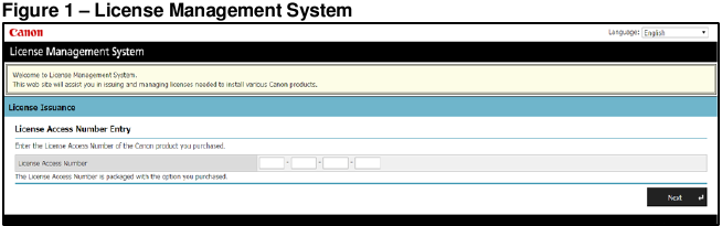 The LMS is a server-based software license program. All purchased software application packages contain a license access number certificate with the documentation. The dealer must enter the license access number and the imageRUNNER 1643 Series device's serial number into the LMS server to generate a license key. The URL to access the LMS server is: http://www.canon.com/lms/ir/.