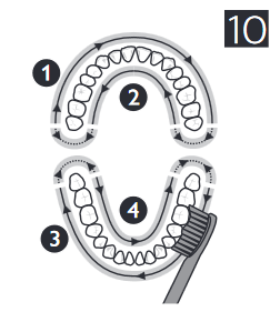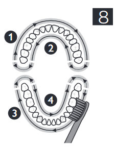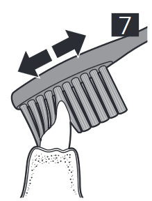 - Gently keep the bristles placed on the teeth and in the gumline. Brush your teeth with small back and forth motion so the bristles reach between the teeth. Continue this motion throughout your brushing cycle.