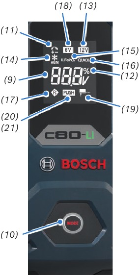 When flash to 12 V icon, press MODE button once more to select 12 V push mode | 12 V batteries. Battery voltage icon flash when battery voltage is between 0.5 V to 3.75 V |