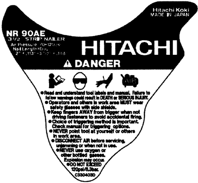 Each Model NR 90AE unit is provided with a Warning Label (illustrated below) which lists basic safety precautions in its use. Carefully ensure that customers fully understand and follow these precautions before using the tool.
