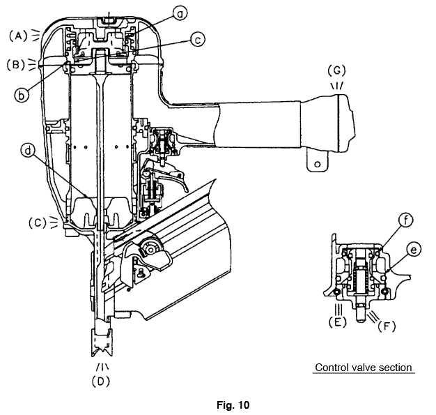 - When Pushing Lever (A) [34] and Trigger (C) [49] are operated together and the Plunger [69] is pushed upward, the compressed air in the valve piston lower chamber is discharged from the bottom of the Plunger [69]. As a result, the compressed air in the accumulator (