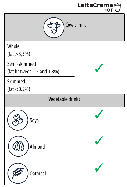 | Vegetable drinks are being used. | For best results, use drinks at refrigerator temperature (about 5°C). Adjust the amount of froth as described in section "Adjusting the amount of froth" | |