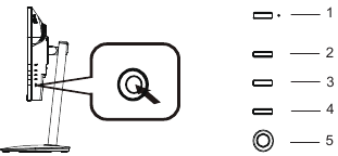 | 1 | Power button | Turns the monitor on/off. Blue indicates power on. Amber indicates standby/power saving mode. |