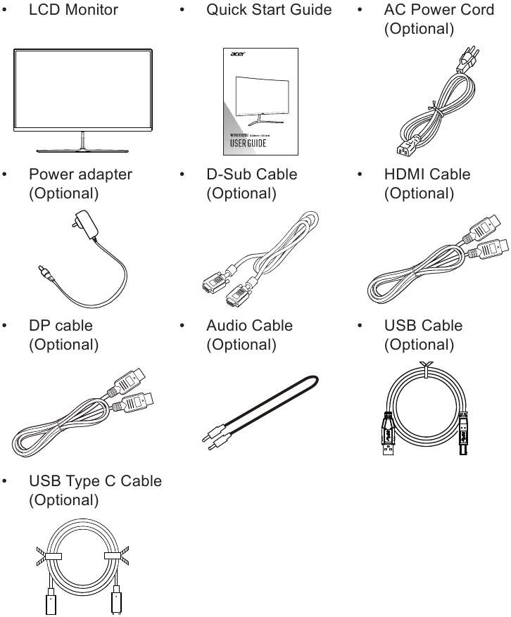 Please check the following items are present when you unpack the box, and save the packing materials in case you will need to ship or transport the monitor in future.