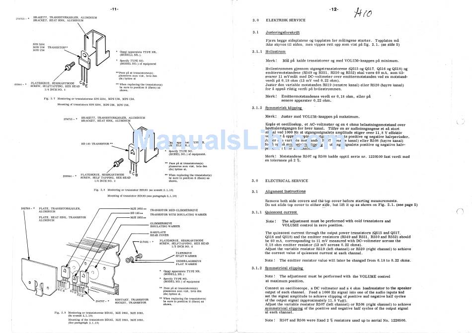 Electrical Service; Alignment Instructions; Quiscent Current; Symmetrical Clipping - TANDBERG Huldra 10 Service Manual
