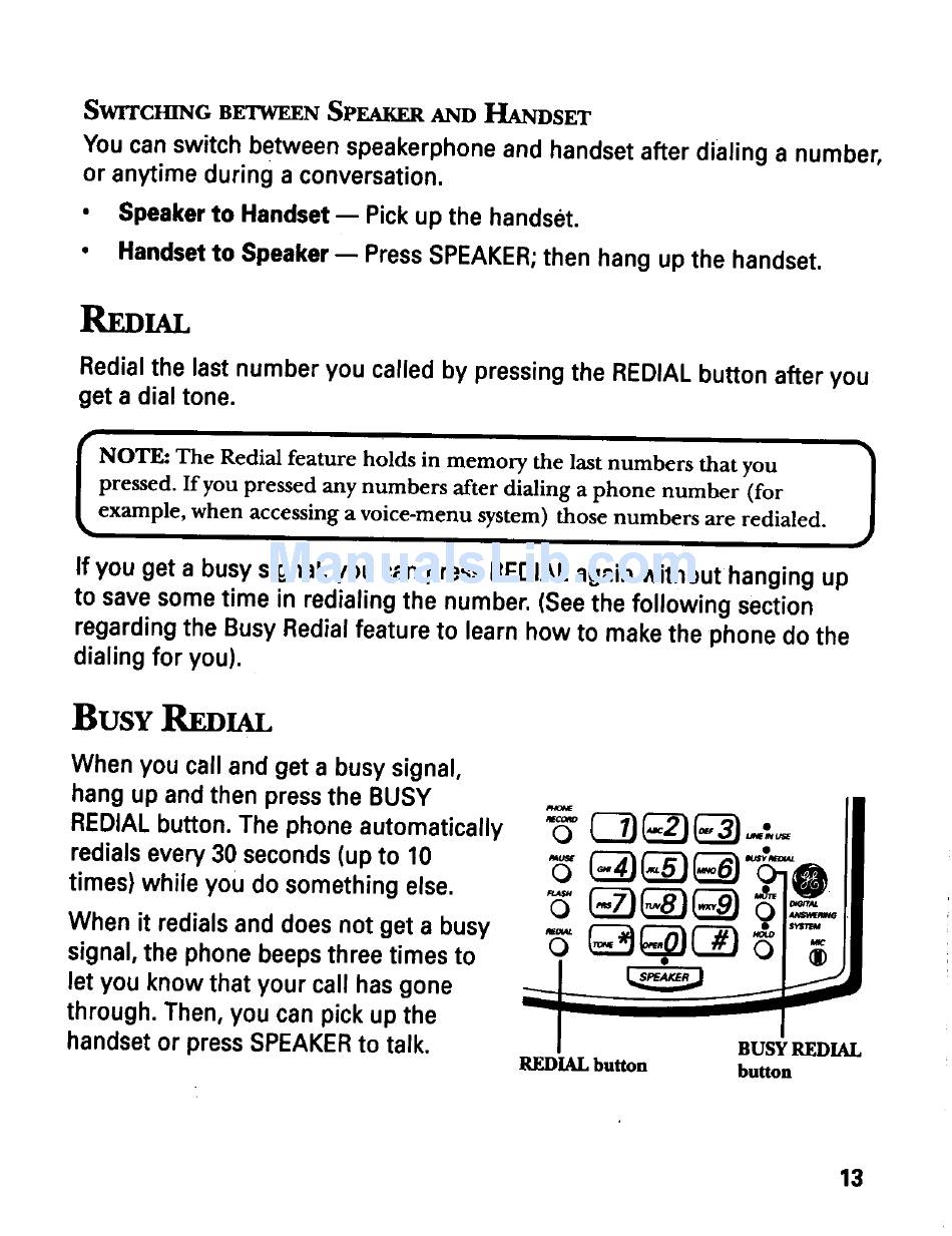 Redial; Switching Between Speaker And Handset; Busy Redial - Ge 2-9985 Proseries User Guide