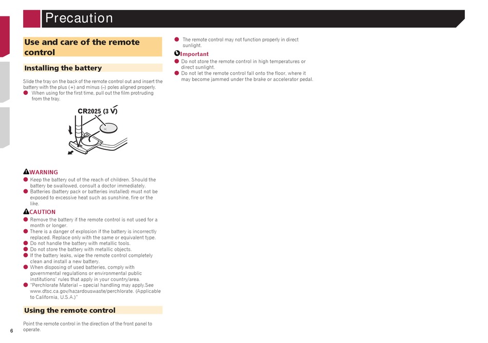 Remove the battery if the remote control is not used for a