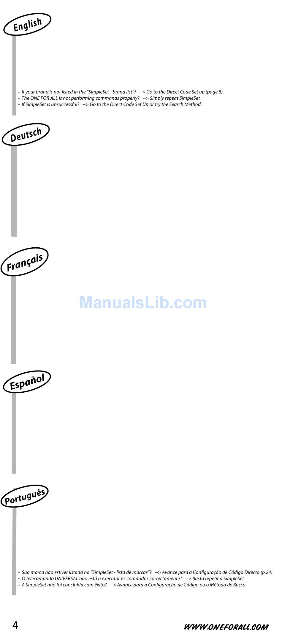 • Die ONE FOR ALL Fernbedienung führt Befehle nicht richtig aus? --> Wiederholen Sie einfach „SimpleSet".