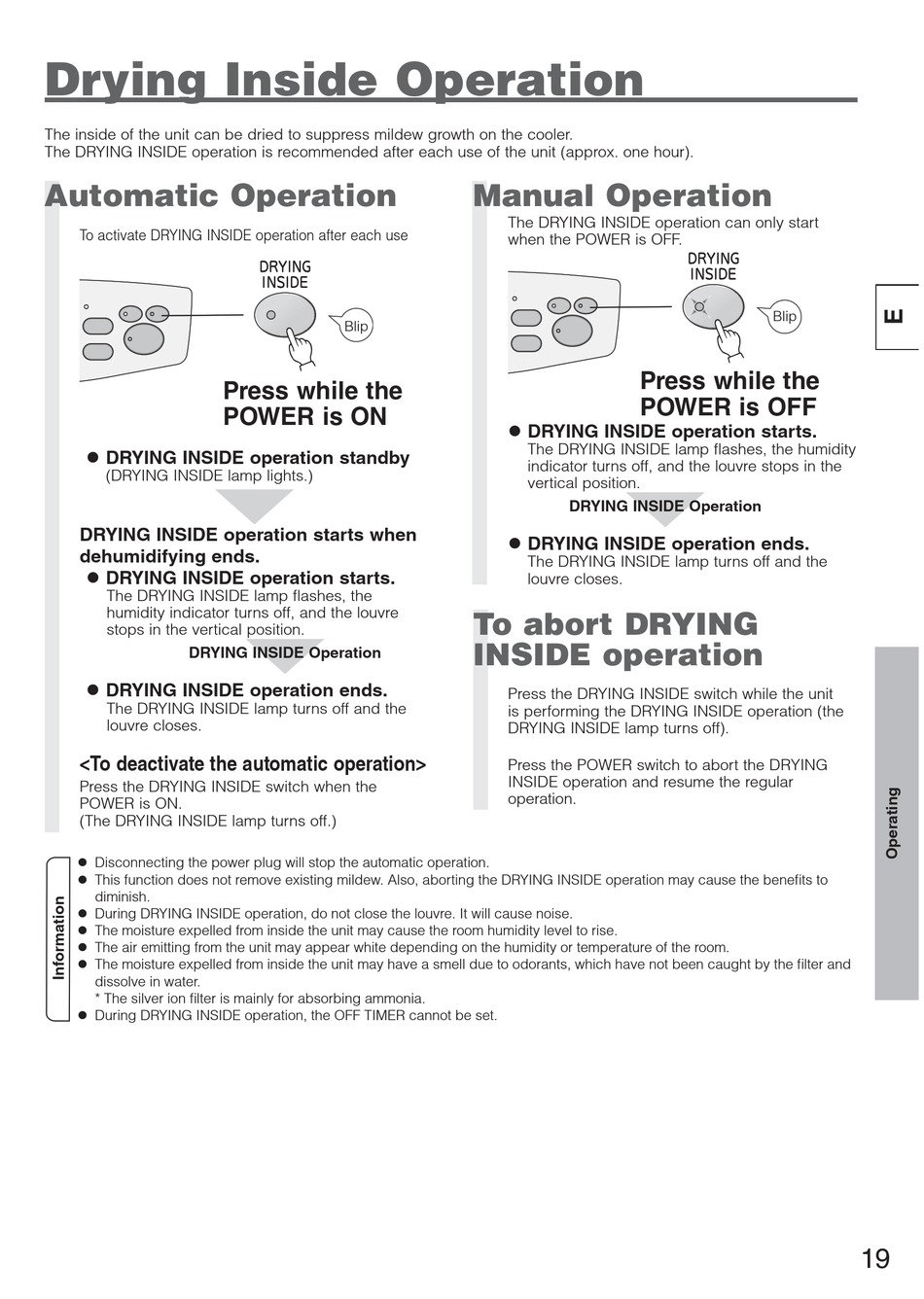 z This function does not remove existing mildew. Also, aborting the DRYING INSIDE operation may cause the benefits to