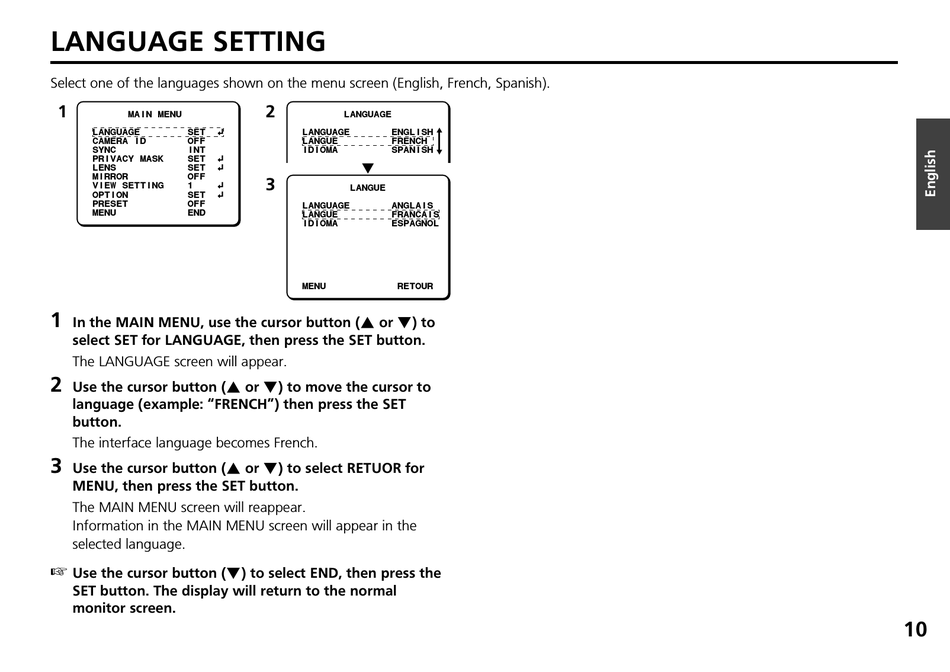 Select one of the languages shown on the menu screen (English, French, Spanish).