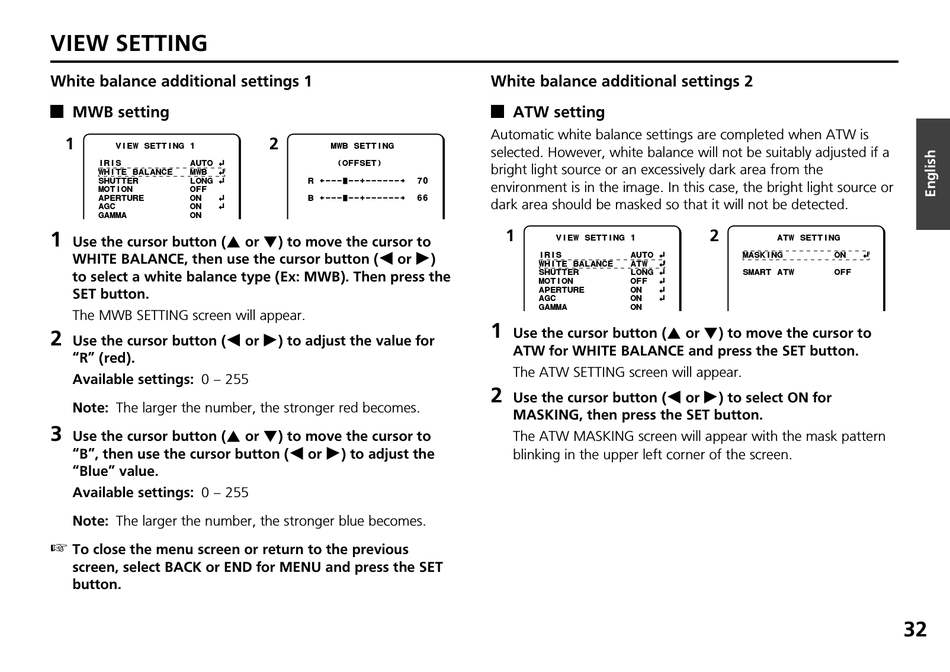 ATW for WHITE BALANCE and press the SET button.