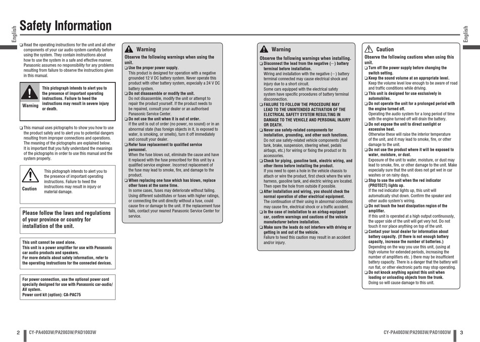 This unit is a power amplifi er for use with Panasonic