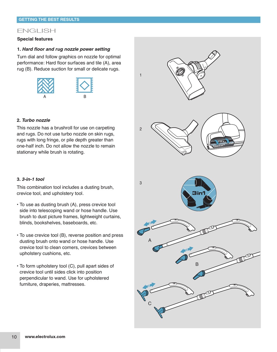 and rugs. Do not use turbo nozzle on skin rugs,