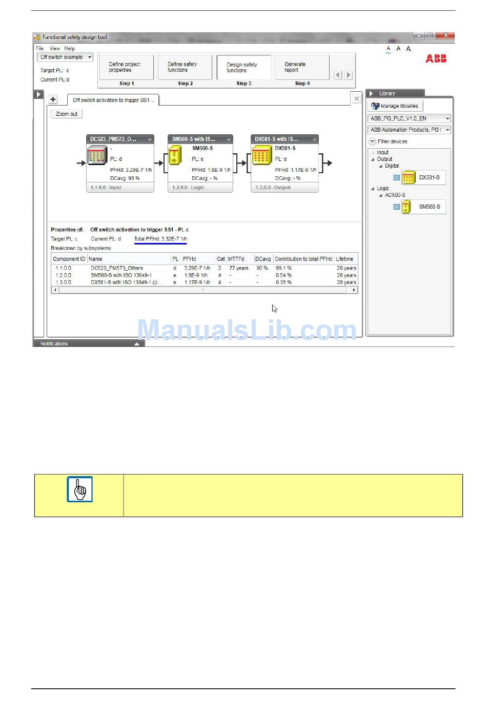 The safety calculation result (see Figure 8) is the PFHavg value of 3.32E-7 1/h for the