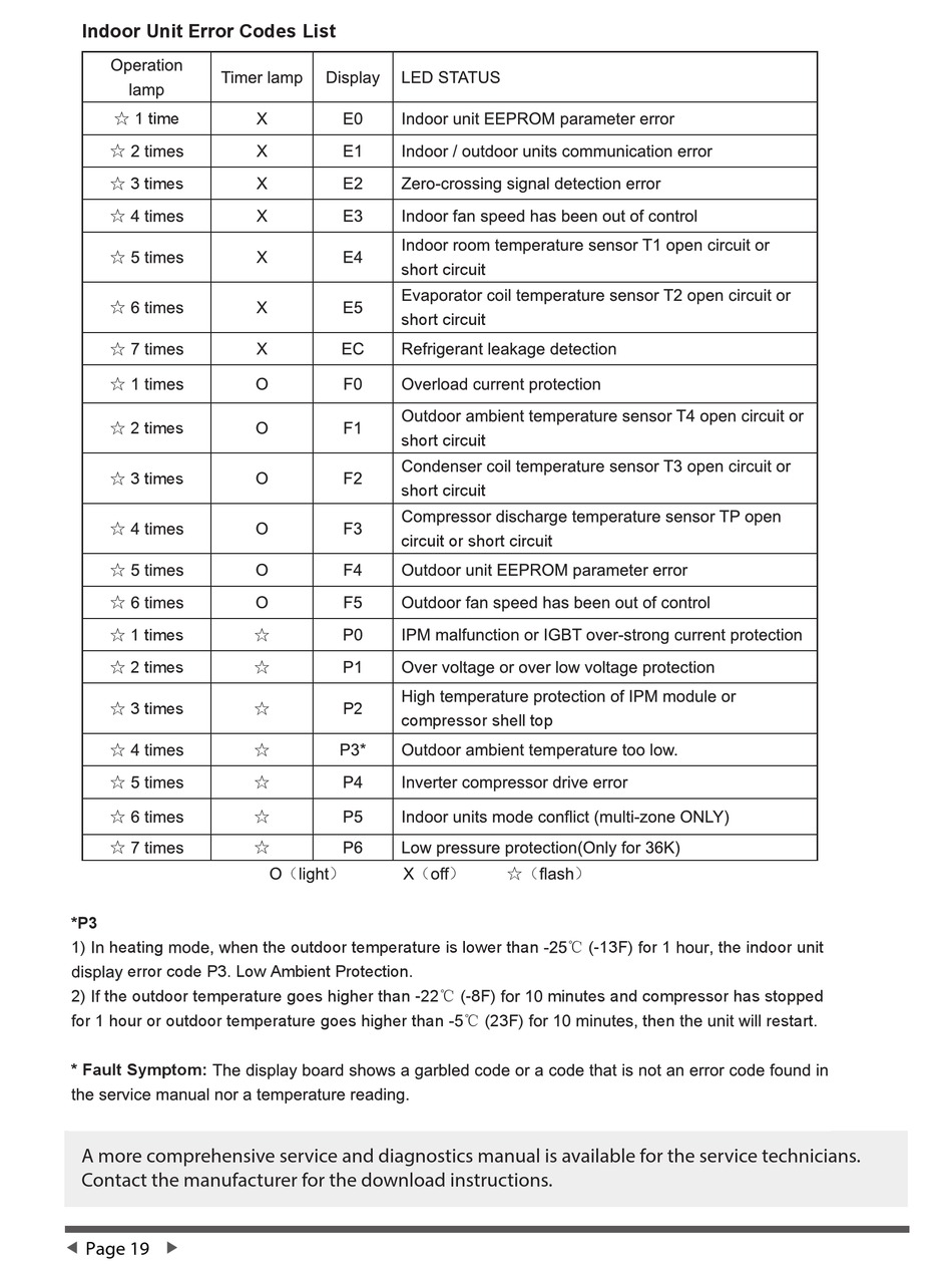 Indoor Unit Error Codes List