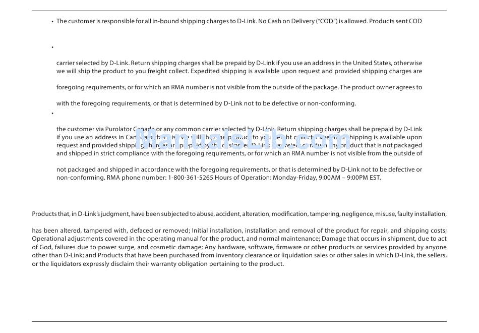 prepaid by the customer. D-Link may reject or return any product that is not packaged and shipped in strict compliance with the