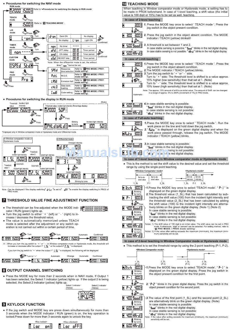 Threshold Value Fine Adjustment Function; Output Channel Switching; Keylock Function; Teaching Mode - Panasonic Ls-401 Instruction Manual
