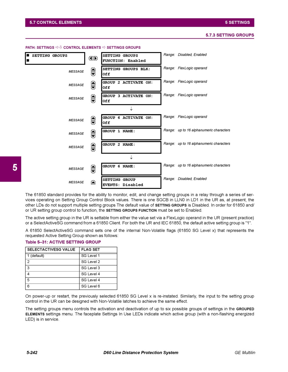 or a SelectActiveSG command from a 61850 Client. For both the UR and IEC 61850, the default active setting group is "1".