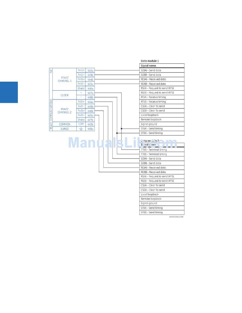 source. As a result, data sampling for both of the UR RS422 channels is synchronized via the send timing leads on data