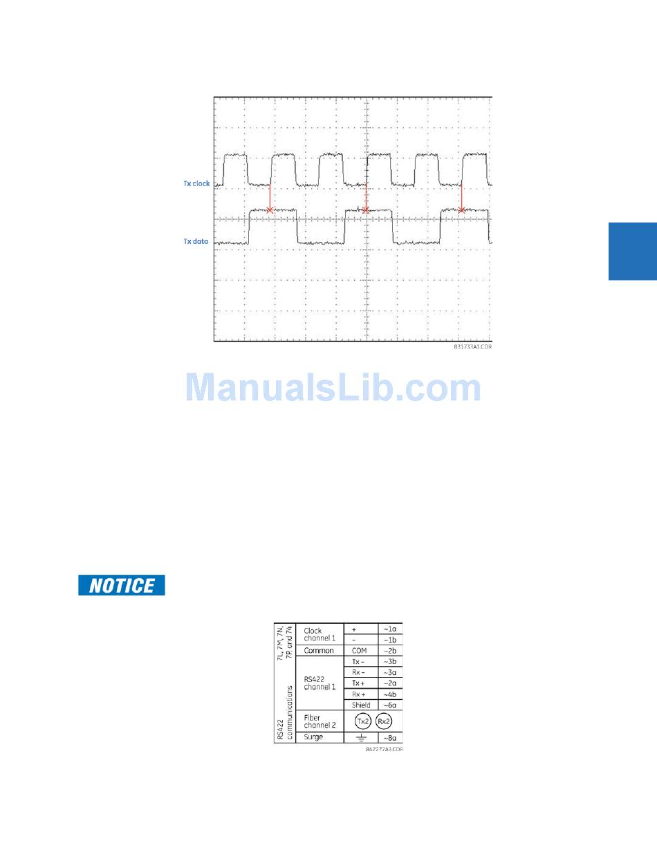 The RS422 interface utilizes NRZI-MARK modulation code and therefore does not rely on an Rx clock to recapture data.