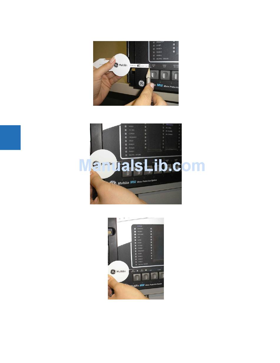 Slide the label tool under the user-programmable pushbutton label until the tabs snap out as shown. This attaches the
