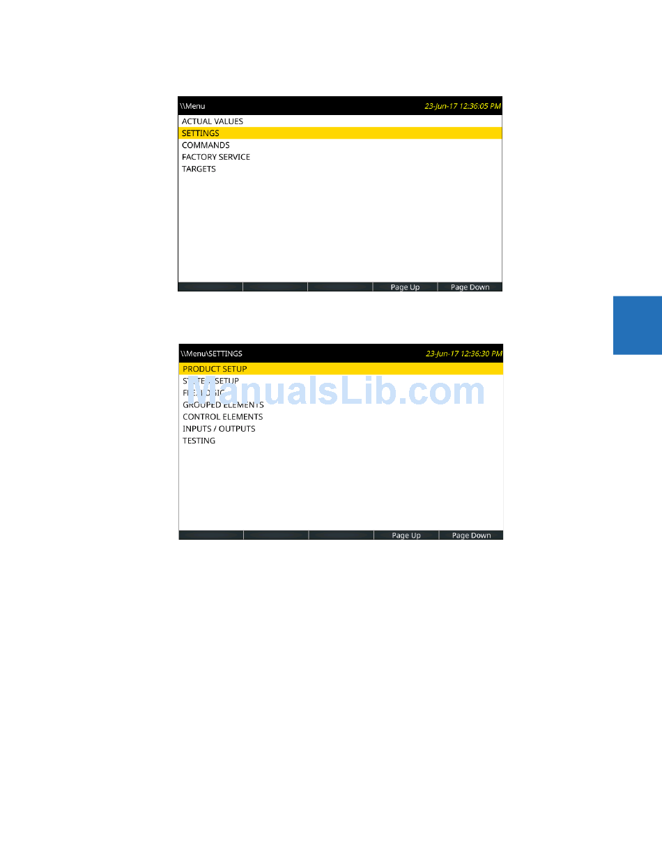 Use the Up or Down pushbutton to select SETTINGS, then press the Right or ENTER pushbutton.