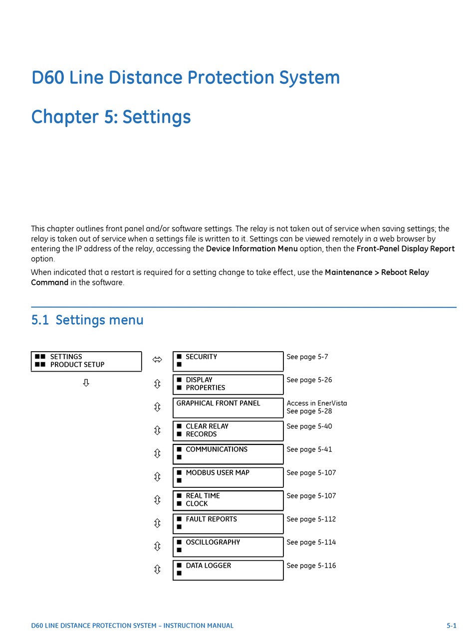 This chapter outlines front panel and/or software settings. The relay is not taken out of service when saving settings; the