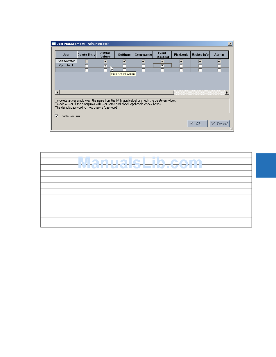 Recorder, and FlexLogic check boxes are enabled by themselves, the user is granted read access. When