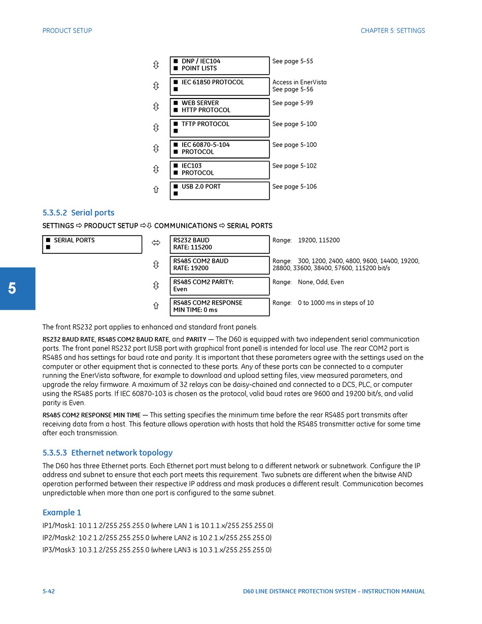 The D60 has three Ethernet ports. Each Ethernet port must belong to a different network or subnetwork. Configure the IP