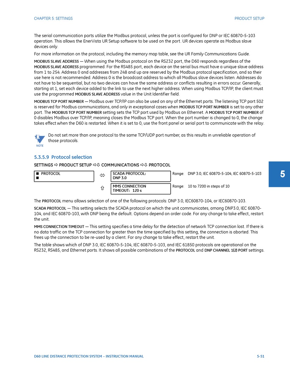 The serial communication ports utilize the Modbus protocol, unless the port is configured for DNP or IEC 60870-5-103