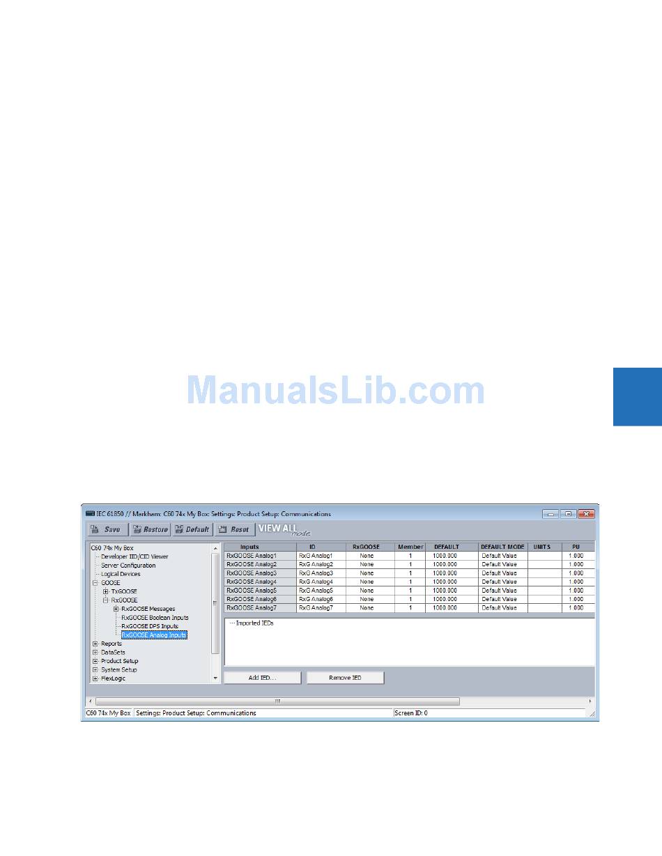 Navigate to Settings > Product Setup > Communications > IEC 61850 > GOOSE > RxGOOSE > RxGOOSE Analog Inputs.