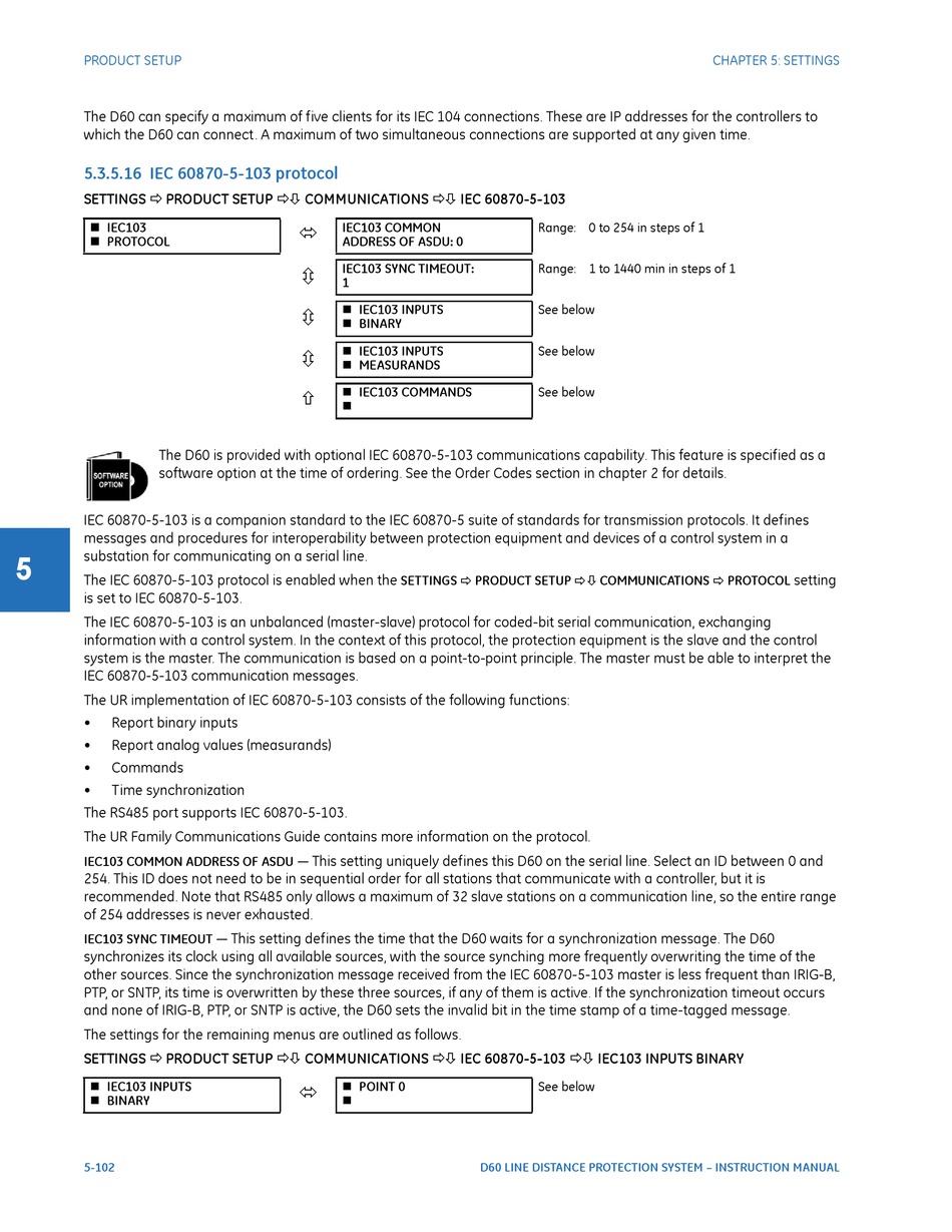 The D60 is provided with optional IEC 60870-5-103 communications capability. This feature is specified as a